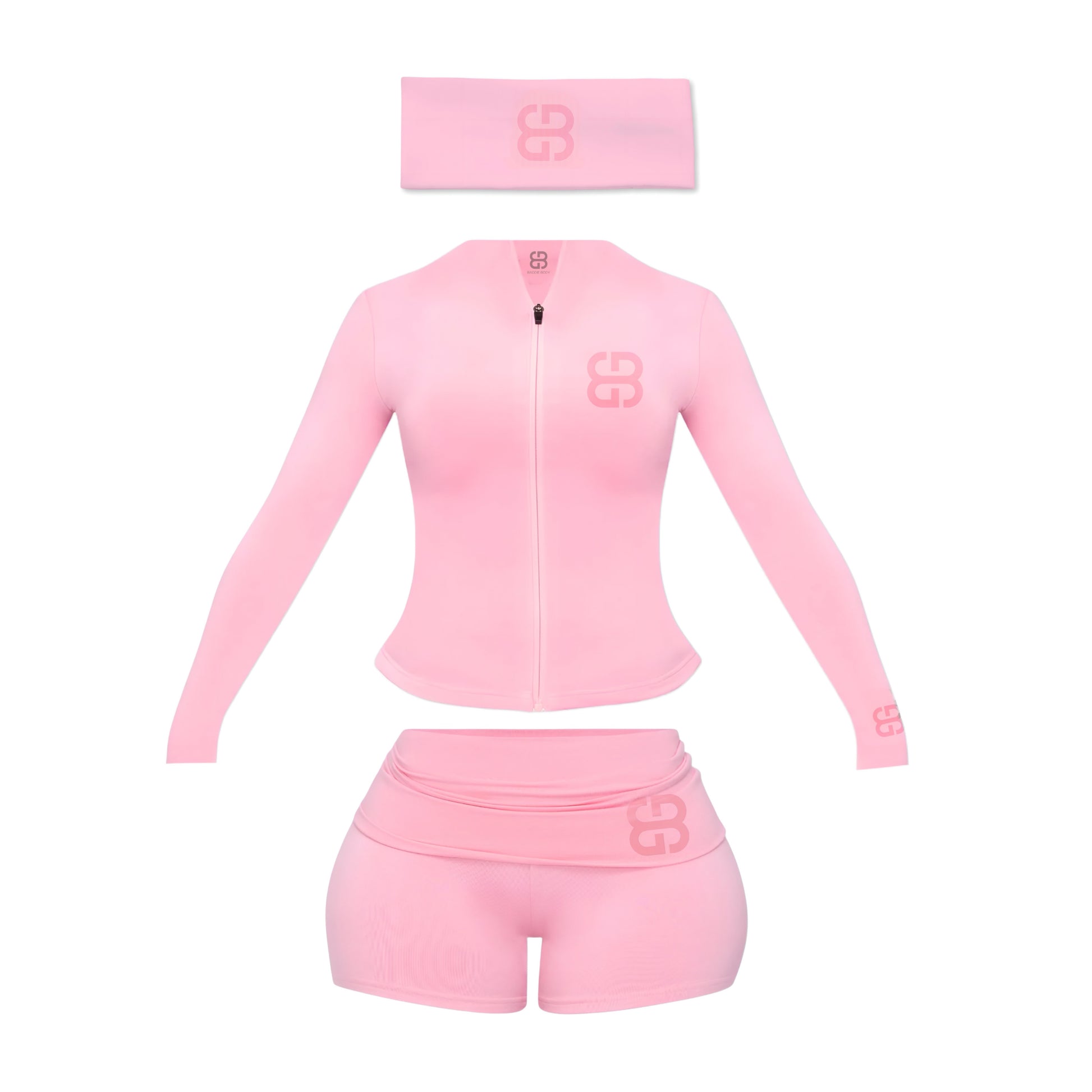 Turn heads while staying comfortable in our Baddie Body Mini Shorts Set. Designed with premium, ultra-soft stretch fabric, this set moves with you while maintaining its shape — so you’re snatched without sacrificing comfort. The Baddie Body logo zip-front jacket, Fold-over shorts, and matching headband create a flawless, coordinated look perfect for lounging, errands, or light workouts for every baddie.
